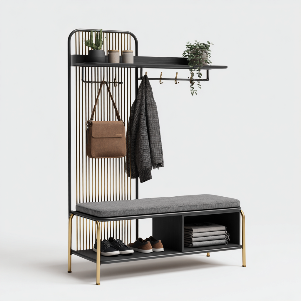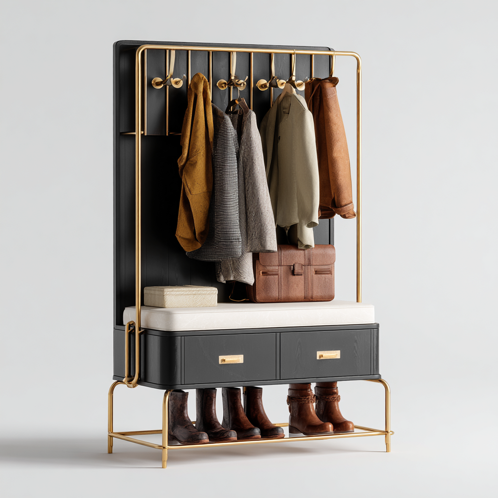 Attaccapanni-metallo-legno-tessuto-110x40x175 cm-nero-oro-grigio-stile contemporaneo
