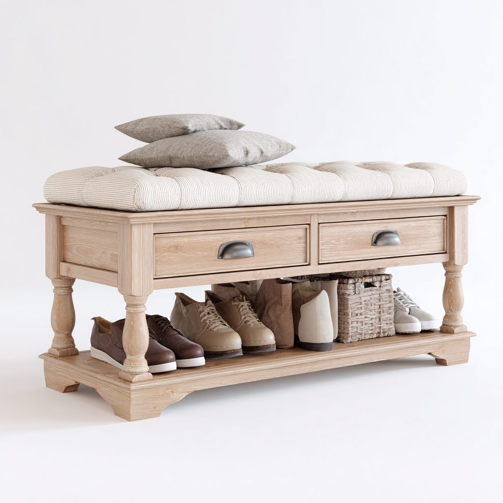 Scarpiera-panca-legno-tessuto-115x38x48 cm-legno naturale-beige-stile classico