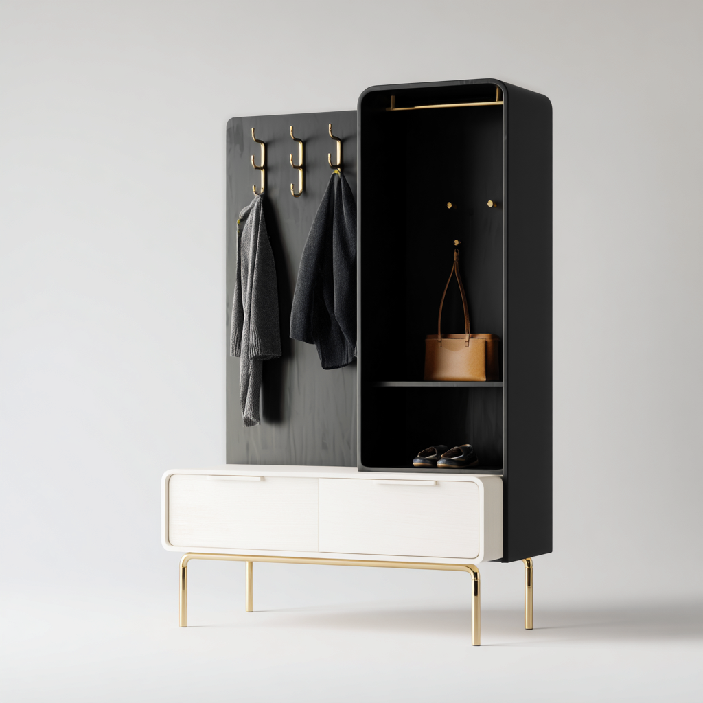 Questo attaccapanni in stile contemporaneo è progettato per l'ingresso e combina area appendiabiti, spazio contenitivo e seduta in una composizione elegante e funzionale. Le linee pulite e i contrasti cromatici rendono il prodotto adatto ad ambienti moderni e raffinati.