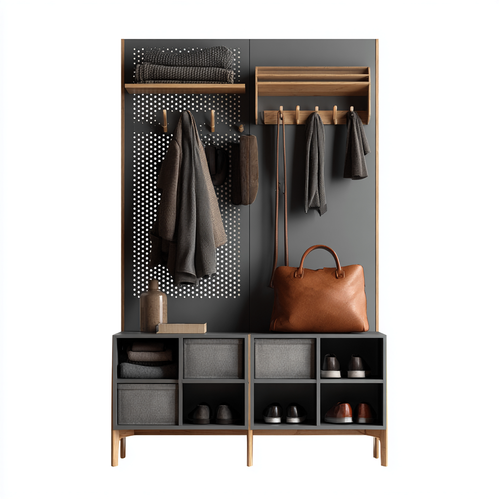 Questo attaccapanni dal design moderno integra funzione contenitiva e appendiabiti in una soluzione pensata per l'ingresso. La struttura compatta consente di organizzare abiti e accessori mantenendo un aspetto ordinato ed equilibrato, ideale per ambienti domestici contemporanei.