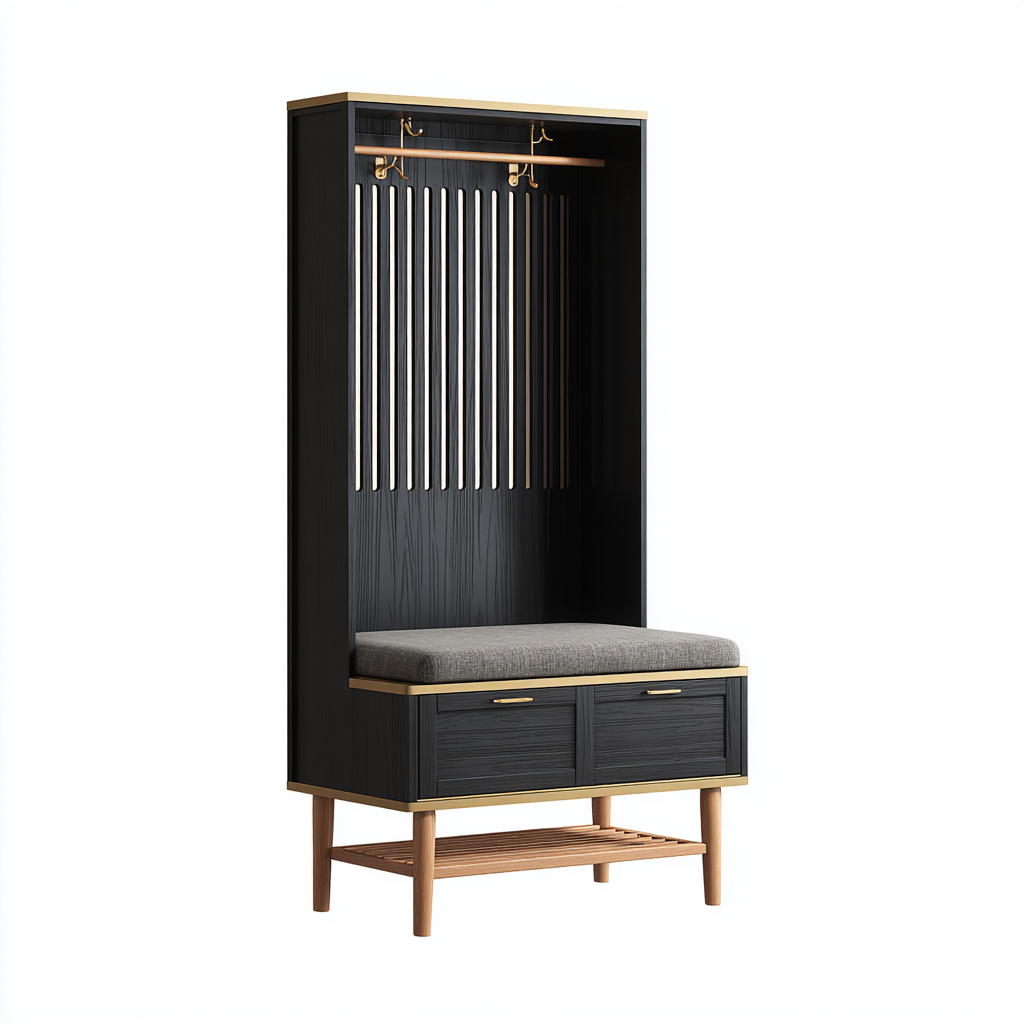 Questo attaccapanni dallo stile contemporaneo è pensato per l'ingresso e offre una soluzione elegante per organizzare abiti e accessori. La composizione verticale con seduta integrata valorizza lo spazio e contribuisce a mantenere un ambiente ordinato e accogliente.