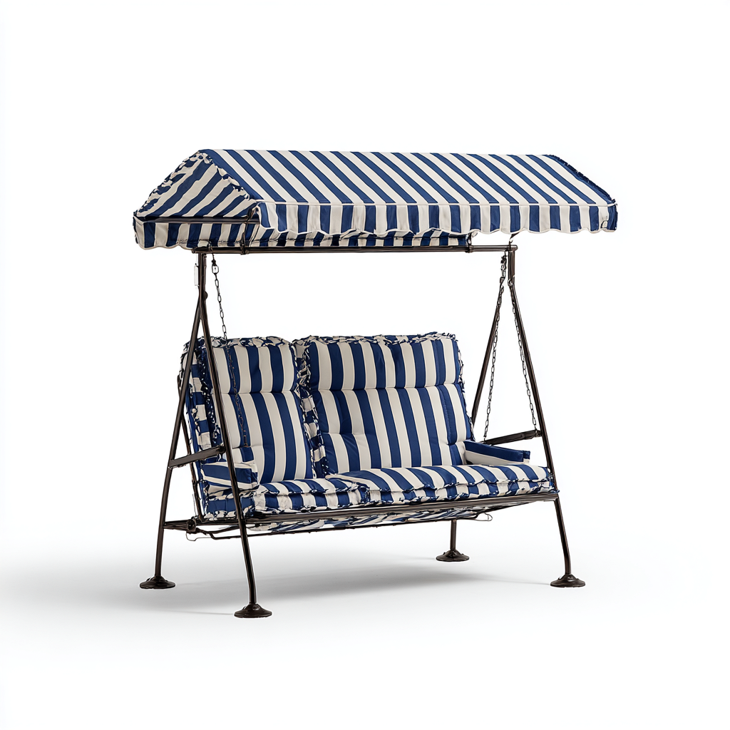 La struttura portante è realizzata interamente in metallo con finitura scura. La seduta e la copertura superiore utilizzano tessuto resistente in colore blu e bianco, adatto all'uso esterno e facile da mantenere.