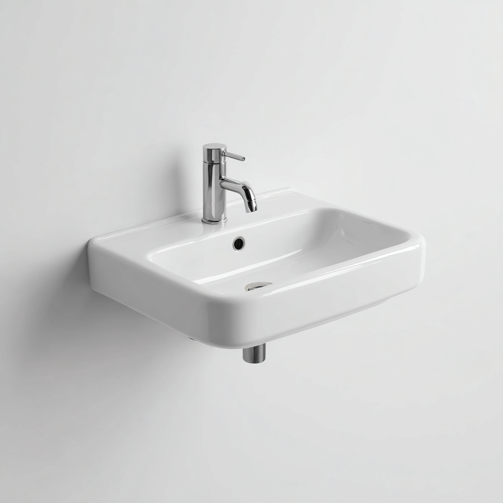 Lavabo da bagno dal profilo rettangolare con bordi morbidi e linee essenziali, progettato per ambienti moderni e minimalisti. La struttura compatta consente un'installazione a parete che valorizza lo spazio e favorisce un aspetto ordinato e pulito.