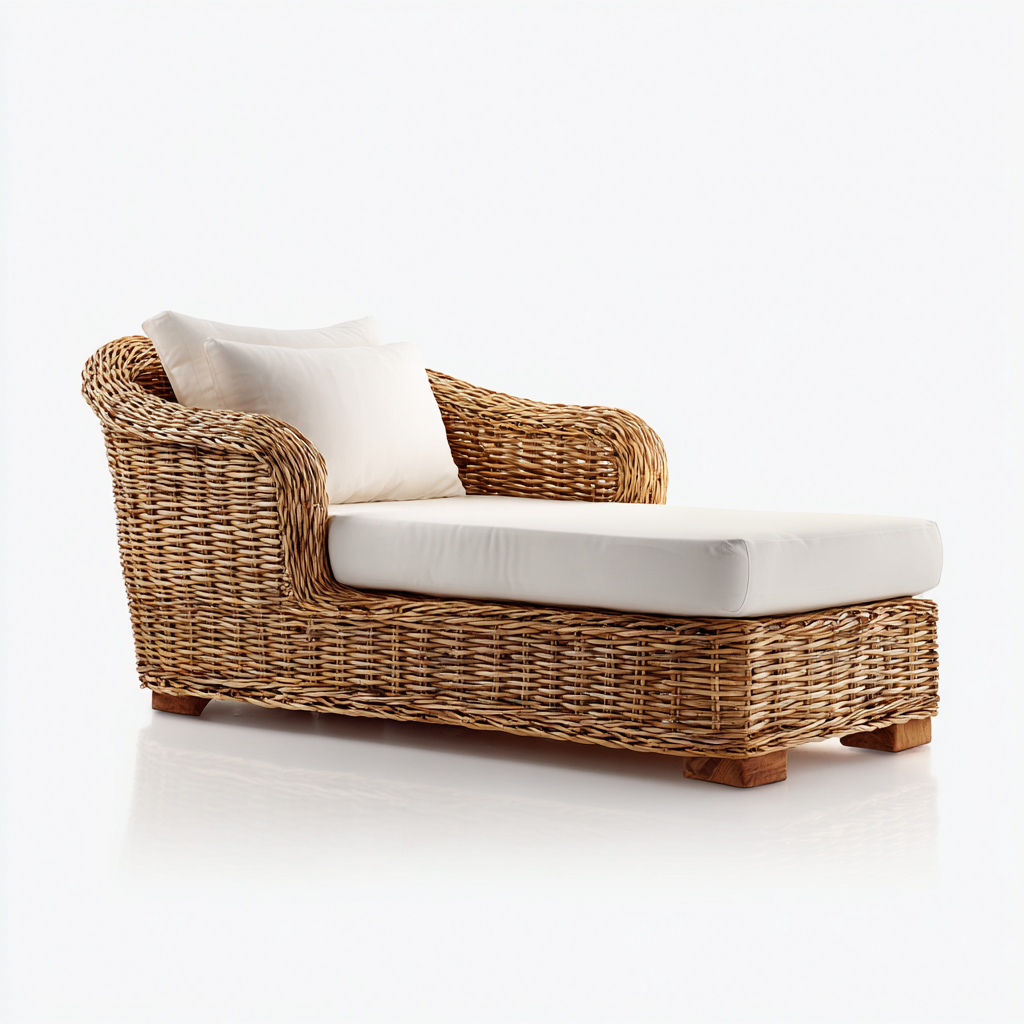 Il lettino presenta una seduta ampia e ben bilanciata, pensata per il relax in posizione distesa. I braccioli integrati in rattan contribuiscono al comfort e definiscono un design armonioso.
