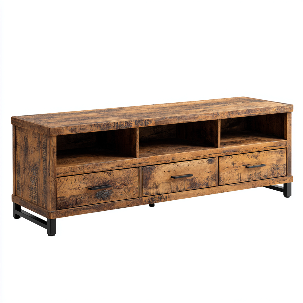Mobile TV dal carattere industriale con struttura solida e finitura dall'aspetto vissuto. Il design lineare e la presenza del metallo conferiscono al mobile un'estetica decisa, adatta a spazi living moderni e ambienti dal gusto contemporaneo.