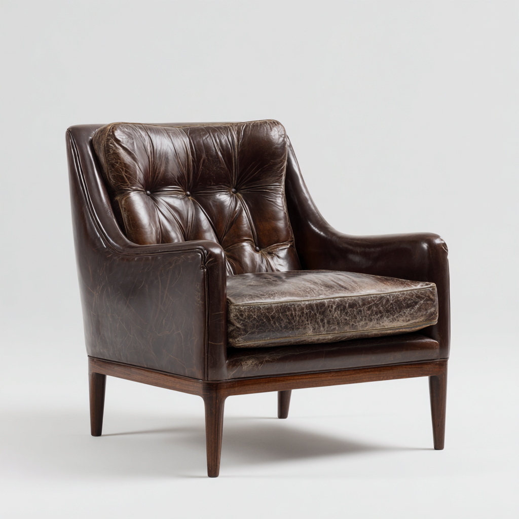 La struttura è rivestita in pelle marrone scuro con lavorazione capitonné sullo schienale. La base e i piedini sono realizzati in legno con finitura coordinata, garantendo stabilità e una resa estetica coerente.