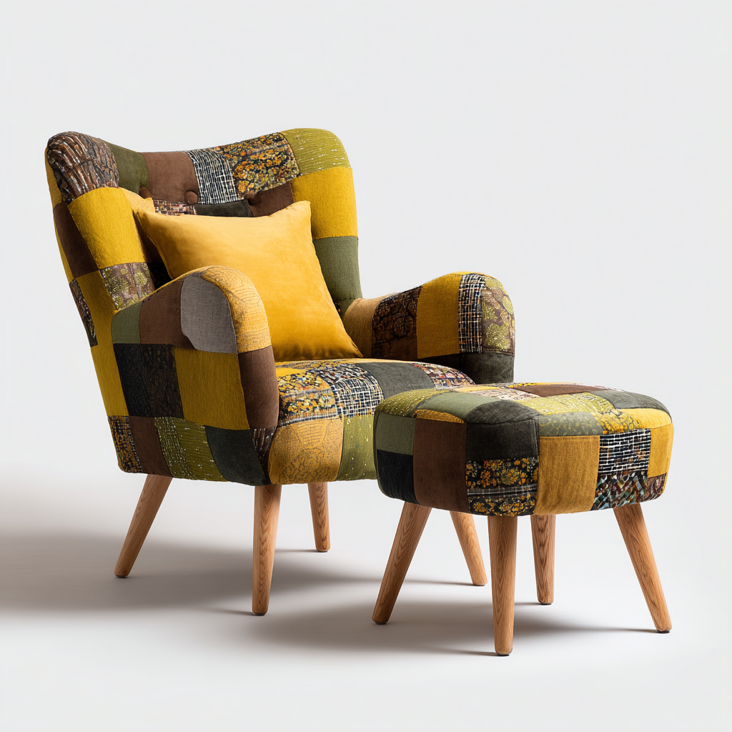 La seduta è rivestita in tessuto con finitura patchwork nei toni giallo verde e marrone. La struttura poggia su gambe in legno naturale che garantiscono stabilità e continuità estetica.