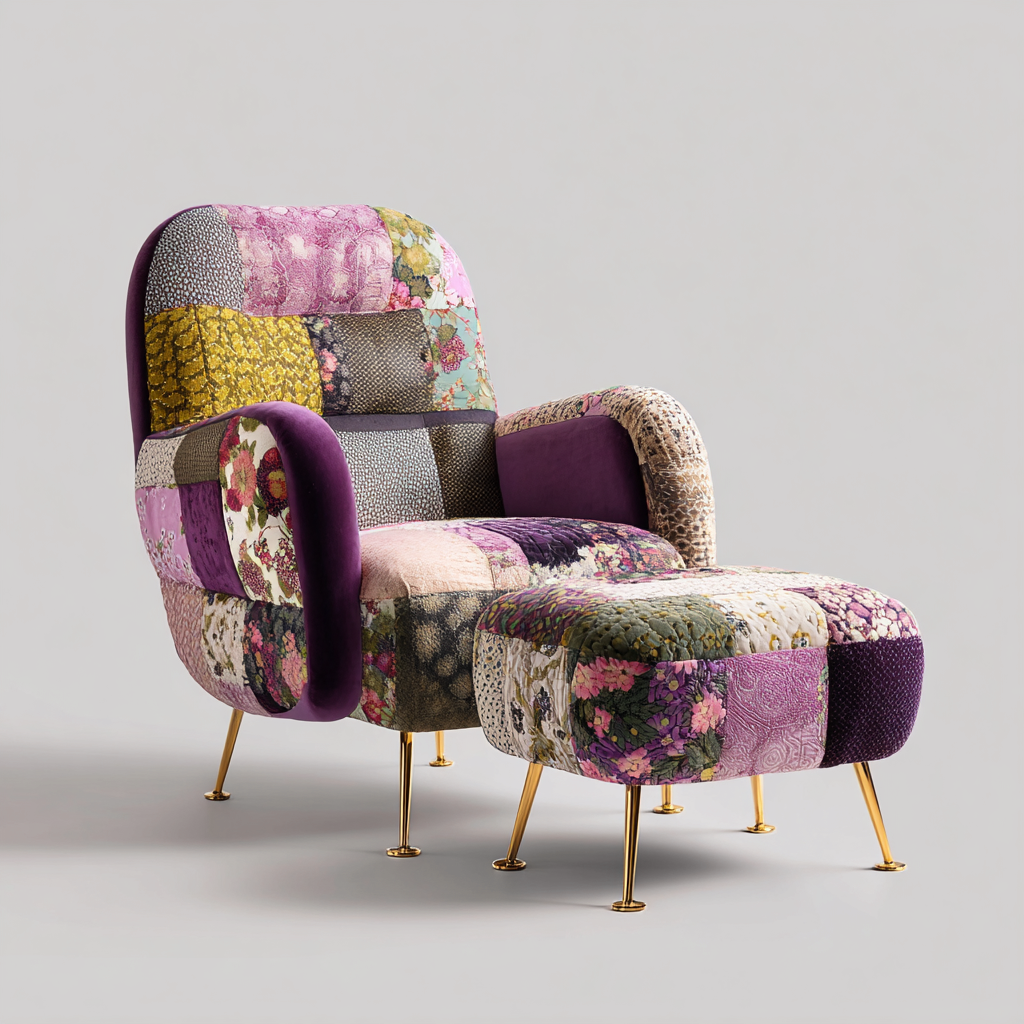 Questa poltrona da interno con pouf coordinato si caratterizza per il rivestimento patchwork decorativo e per la forma accogliente. È adatta a soggiorni, zone relax e spazi creativi, offrendo una seduta confortevole con un forte impatto visivo.