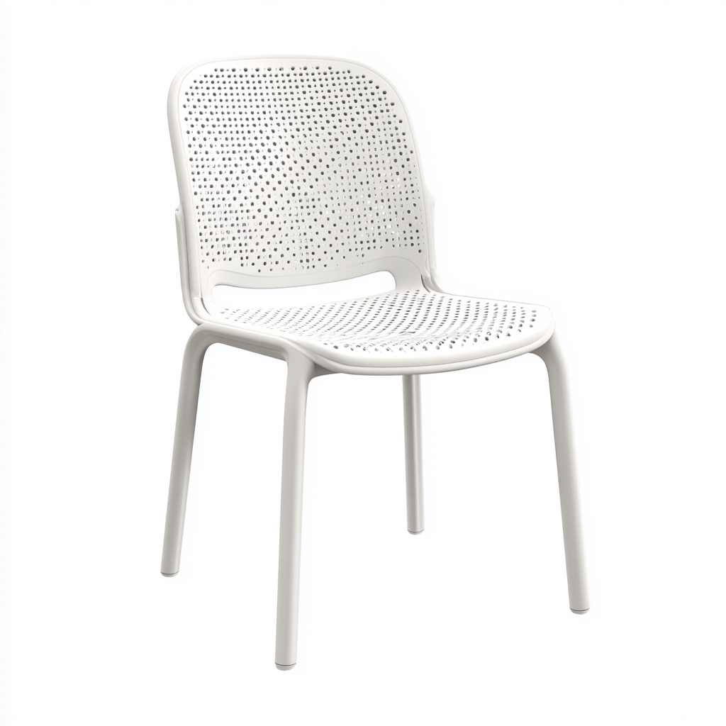 Realizzata interamente in plastica di colore bianco, con superficie traforata su seduta e schienale per favorire la ventilazione e il drenaggio dell'acqua. La struttura monoscocca assicura stabilità e uniformità estetica.