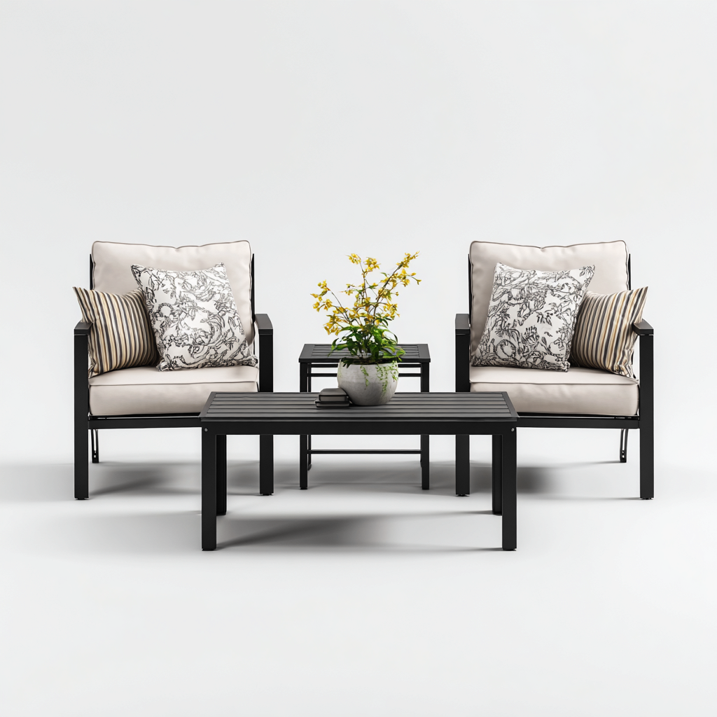 Il set offre una configurazione compatta e pratica, ideale per momenti di relax all'aperto. Il tavolino centrale assicura un piano d'appoggio stabile, mentre le sedute presentano una struttura ergonomica adatta all'uso quotidiano.