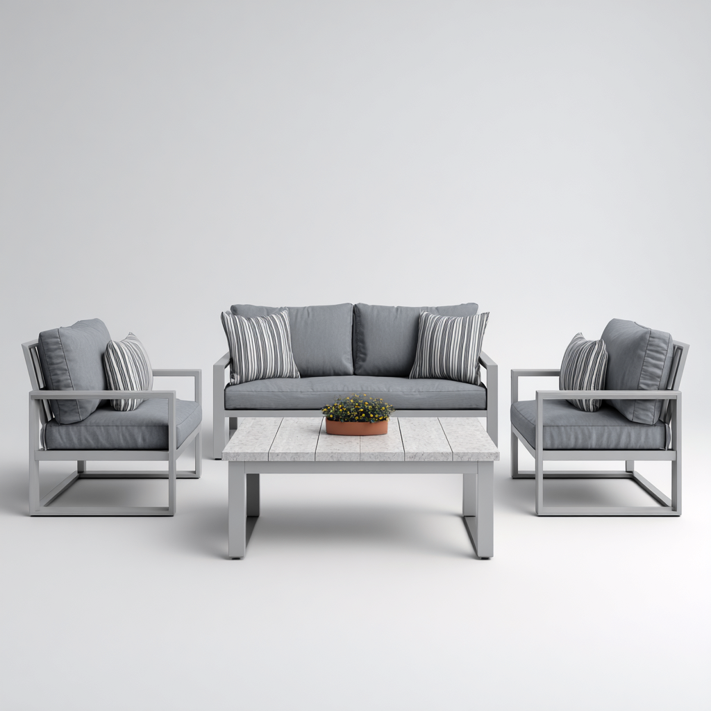 Set salotto da terrazza pensato per arredare con eleganza e funzionalità spazi esterni come terrazze, balconi e giardini. La composizione equilibrata crea un'area accogliente per il relax quotidiano e per momenti di convivialità all'aperto.